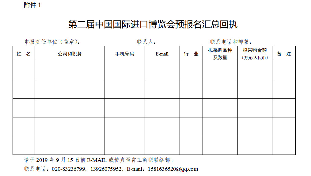 (二)省工商联、各地级以上市工商联或省级商协会为申报责任单位,请及时组织企业在9月15日前自行完成申报注册参会资格。各申报责任单位必须严格把关审核参会企业,及时汇总预报名情况,加盖工商联或商协会公章予以确认核实,并于9月20日前将预报名汇总回执(附件1)反馈至省工商联。根据上级要求,各申报责任单位在博览会结束后,须于11月15日前统计汇报参会企业的实际采购品类、数量和总金额,并报送至省工商联,汇总表参照预报名汇总回执。