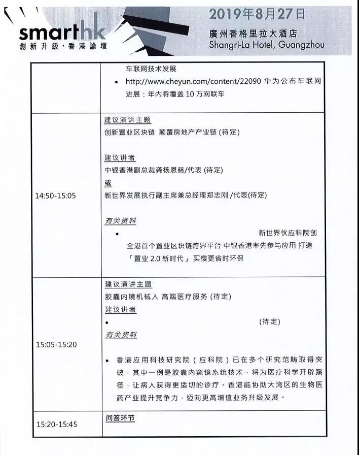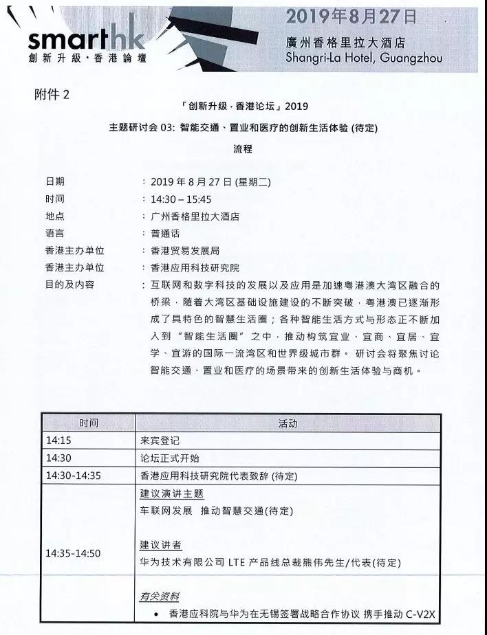 2.“创新升级 香港论坛”主题研讨会;智能交通、置业和医疗的创新生活体验流程(待定)